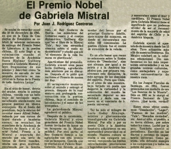 El premio nobel de Gabriela Mistral [artículo] Juan J. Rodríguez Contreras.