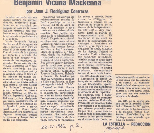 Benjamín Vicuña Mackenna [artículo] Juan J. Rodríguez Contreras.