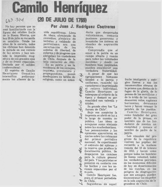 Camilo Henríquez (20 de julio de 1769) [artículo] Juan J. Rodríguez Contreras.