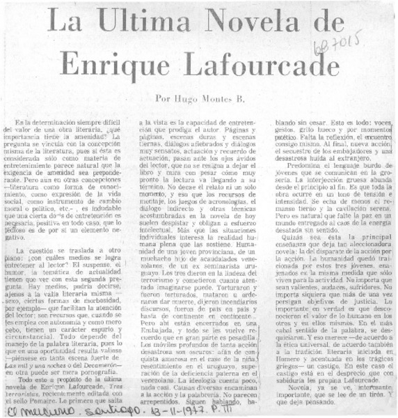 La última novela de Enrique Lafourcade [artículo] Hugo Montes.