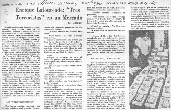 Enrique Lafourcade: "Tres terroristas" en un mercado [artículo] Suetonio.