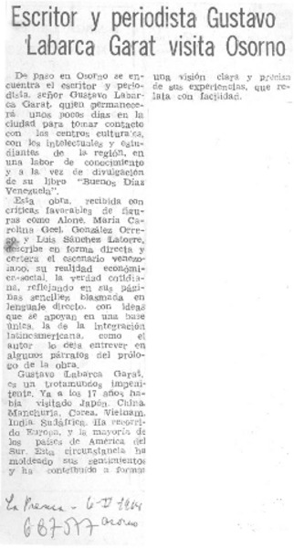 Escritor y periodista Gustavo Labarca Garat visita osorno. [artículo]
