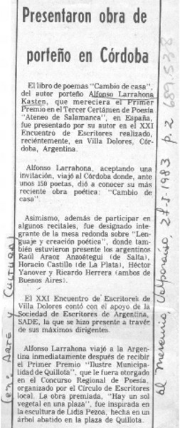 Poeta Larrahona presentó poemario en encuentro escritores: Argentina. [artículo]