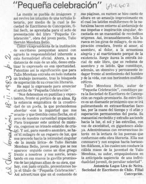 Pequeña celebración [artículo] Antonieta Lagos Lira de Neira.