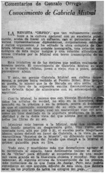 Conocimiento de Gabriela Mistral [artículo] Gonzalo Orrego.