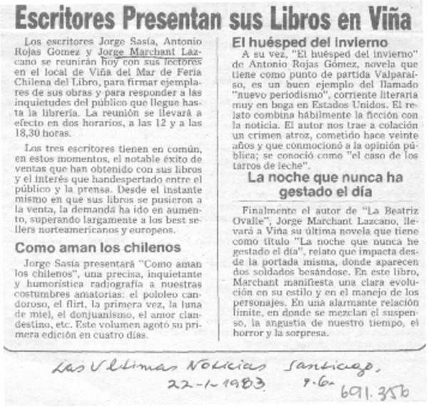 Jorge Sasía firmará libros hoy en Viña. [artículo]