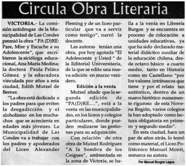 Circula obra literaria [artículo] Manuel Burgos Lagos.