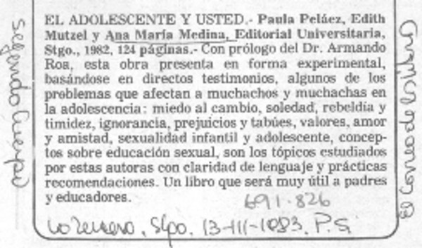 Mützel de Berner, Edith - El adolescente y usted - Medina, Ana María - Autores chilenos - Peláez, Paula