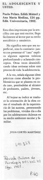 Peláez, Paula - Autores chilenos - Medina, Ana María - Mützel de Berner, Edith - Adolescente y usted