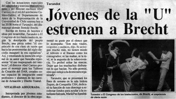 Jóvenes de la "U" estrenan a Brecht [artículo].