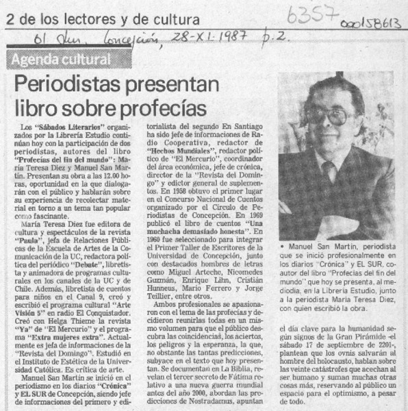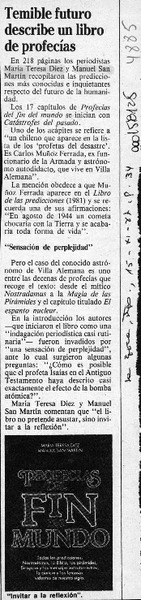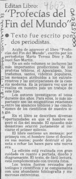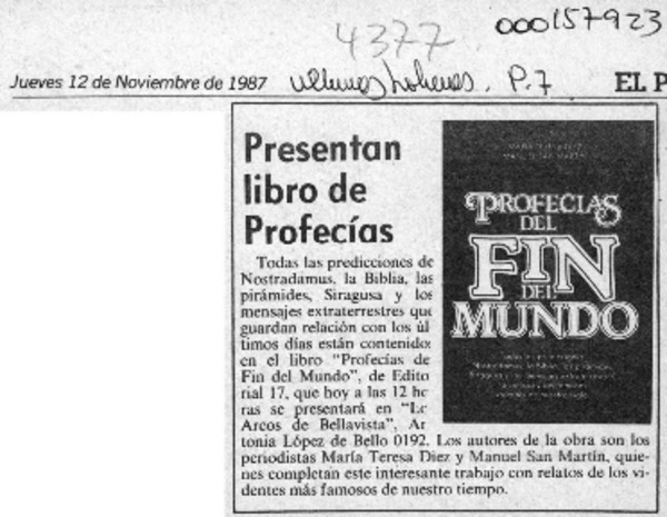 Periodista lanza libro "Profecías del fin del mundo" [artículo].