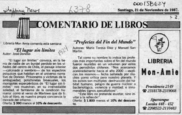DONOSO, JOSE - PROFECIAS DEL FIN DEL MUNDO - DIEZ, MARIA TERESA - LUGAR SIN LIMITES - SAN MARTIN, MANUEL