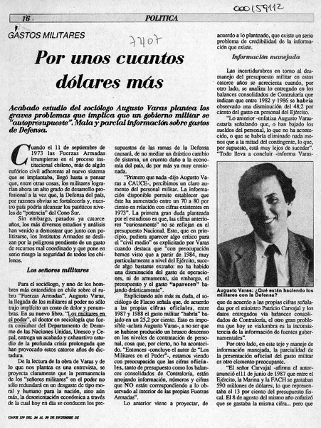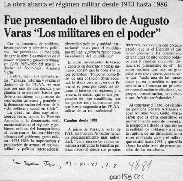 Fue presentado el libro de Augusto Varas "Los militares en el poder" [artículo].