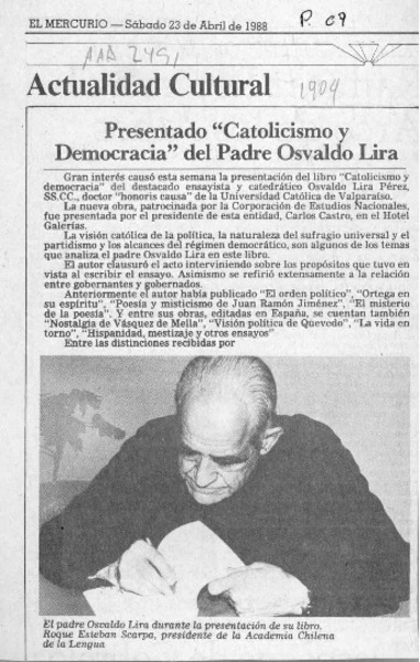 Presentado "Catolicismo y Democracia" del Padre Osvaldo Lira [artículo].