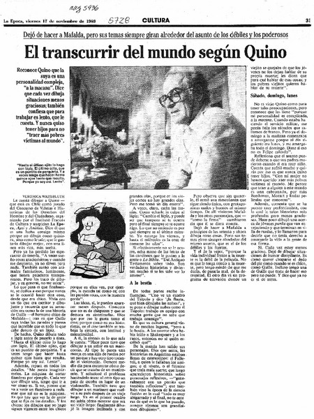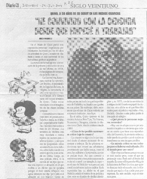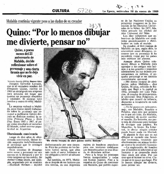 Quino, "Por lo menos dibujar me divierte, pensar no" [artículo] Victoria Azurdy.
