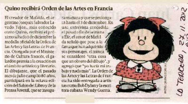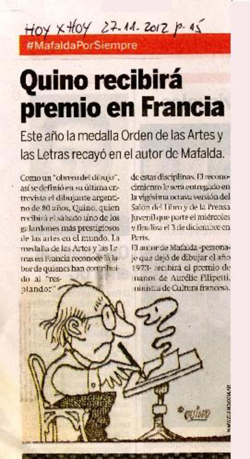 Quino recibirá premio en francia [artículo]