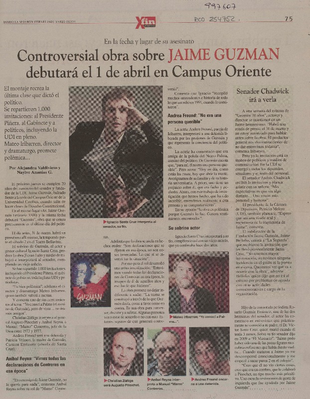 Controversial obra sobre Jaime Guzmán debutará el 1 de abril en Campus Oriente [artículo] Alejandra Valdivieso y Nayive Ananías G.