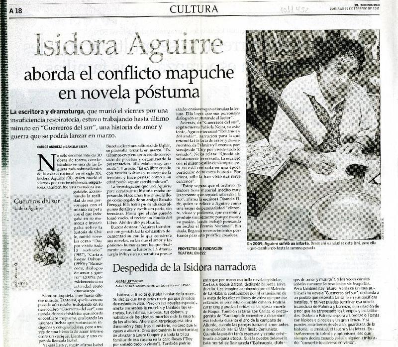 Isidora Aguirre aborda el conflicto mapuche en novela póstuma [artículo] Carlos Andueza.