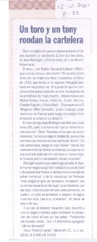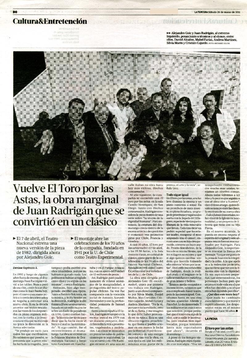 Grupo Tiara estrena el viernes "El toro por las astas" de Radrigán. [artículo]