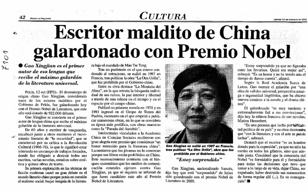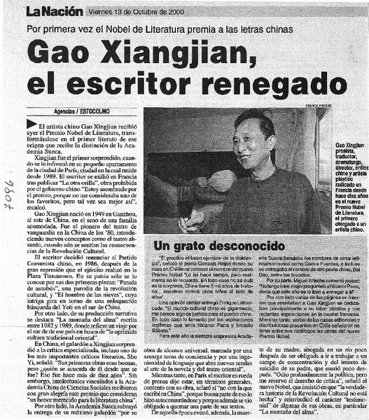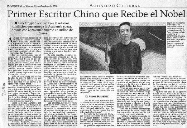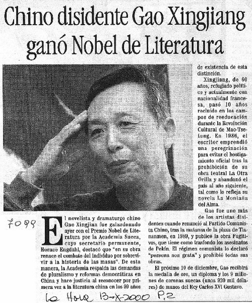 El Escritor disidente Gao Xingjian logra el primer Nobel de Literatura para su lengua. [artículo]