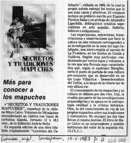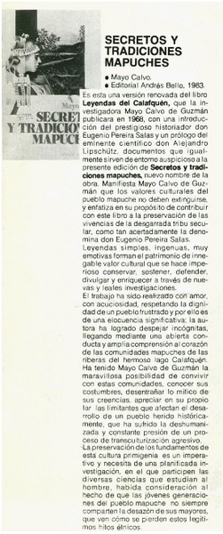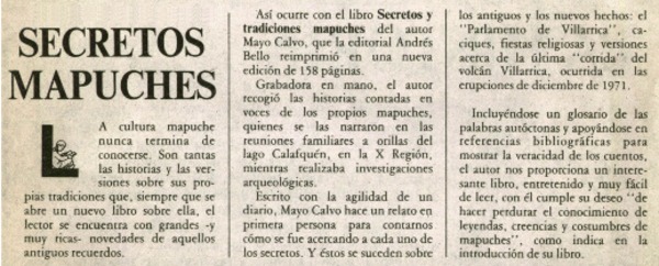 Mayo Calvo, "Secretos y tradiciones mapuches" [artículo] Wellington Rojas Valdebenito.