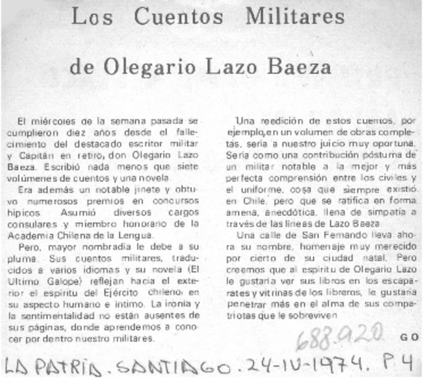 Los cuentos militares de Olegario Lazo Baeza [artículo] G.O.