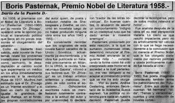 Boris Pasternak, Premio Nobel de literatura 1958 [artículo] Darío de la Fuente.