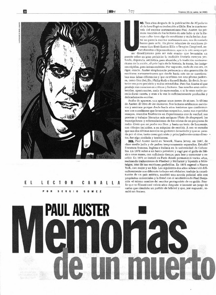 Paul Auster memorias de un muerto [artículo] Sergio Gómez.