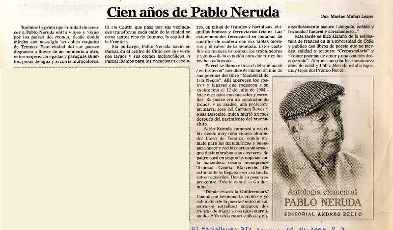 Cien años de Pablo Neruda [artículo] Marino Muñoz Lagos.