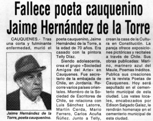 Fallece poeta cauquenino Jaime Hernández de la Torre. [artículo]