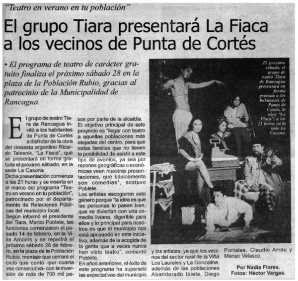 El grupo Tiara presentará La Fiaca a los vecinos de Punta de Cortés [artículo] Nadia Flores.