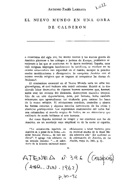 El nuevo mundo en una obra de Calderón [artículo] Antonio Pagés Larraya.