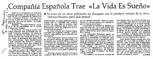 Compañía española trae "La vida es sueño" [artículo] J.A.M.H.