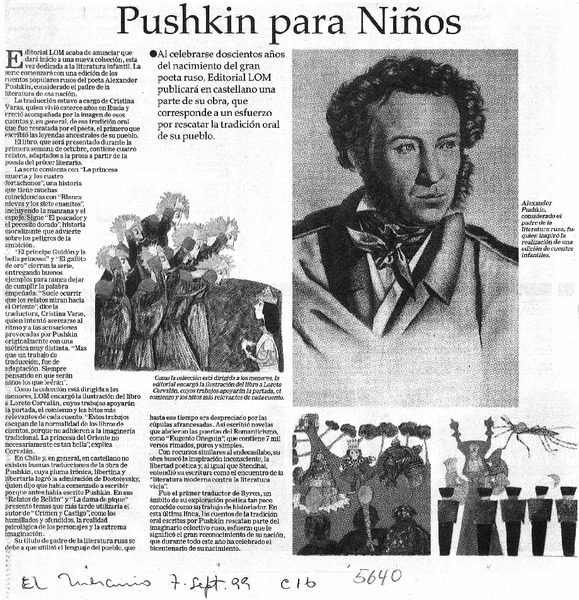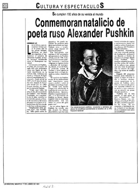 Conmemoran natalicio de poeta ruso Alexander Pushkin. [artículo]
