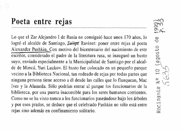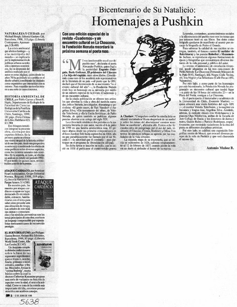 Bicentenario de su natalicio: Homenajes a Pushkin [artículo] Antonio Muñoz B.