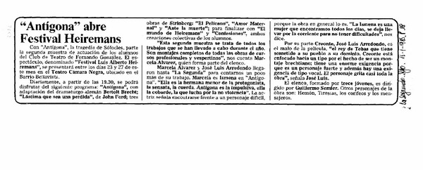 "Antígona" abre Festival Heiremans. [artículo]