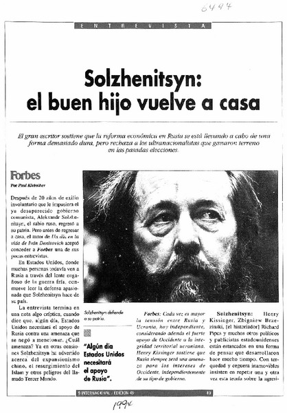 Solhenitsyn : el buen hijo vuelve a casa [artículo] Paul Klevnikov.