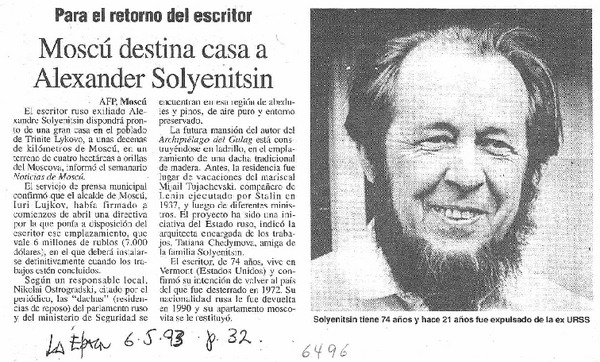 Moscú destina casa a Alexander Solyenitsin [artículo]