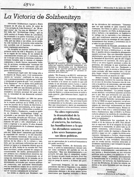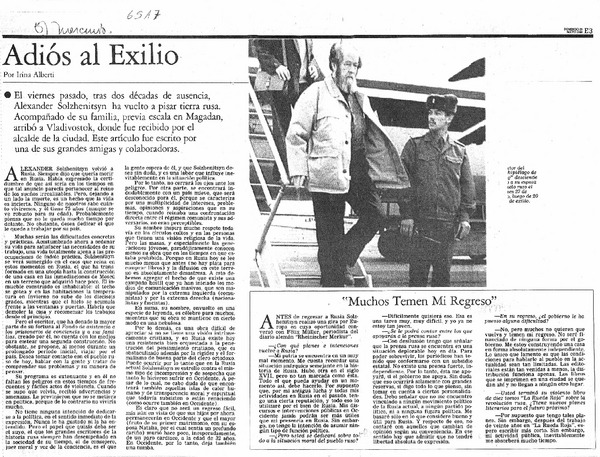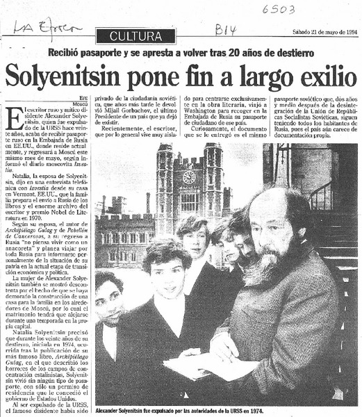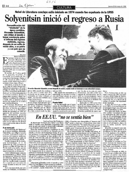 Solyenitsin pone fin a largo exilio recibió pasaporte y se apresta a volver tras 20 años de destierro [artículo] :