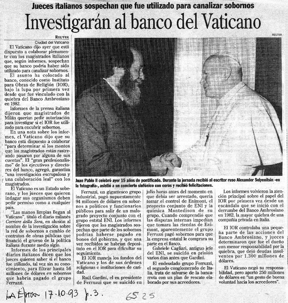 Investigarán al banco del Vaticano Jueces italianos sospechan que fue utilizado para canalizar sobornos [artículo] :