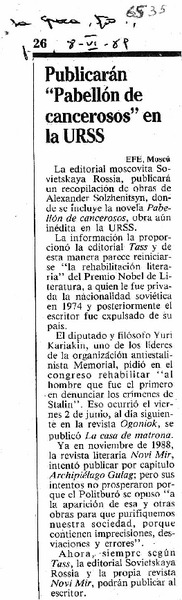 Publicarán "Pabellón de cancerosos" en la URSS [artículo]