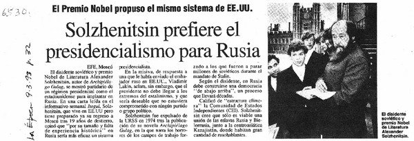Solzhenitsyn prefiere el presidencialismo para Rusia [artículo]