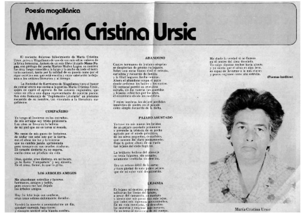 Libro de poemas de María Cristina Ursic aparecerá en breve en Punta Arenas. [artículo]