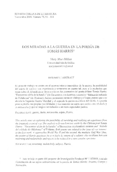 Dos miradas a la guerra en la poesía de Tomás Harris [artículo] Mary Mac-Millan.