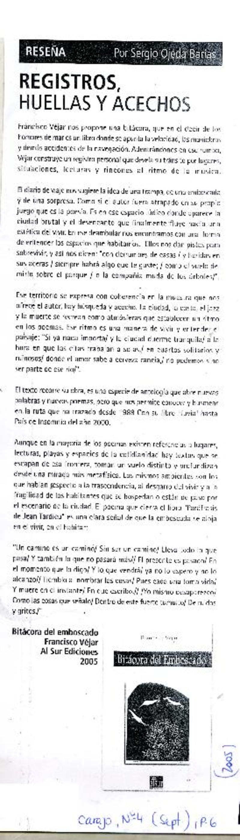 Bitácora del emboscado de Francisco Véjar [artículo] Pedro Lastra.