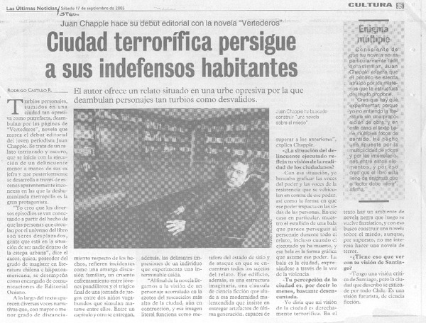 Ciudad terrorífica persigue a sus indefensos habitantes. (entrevistas) [artículo] Castillo R., Rodrigo