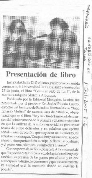 De escritora Marcela Albornoz Dachelet presentaron libro "Cosas al oído de Lulú" [artículo]