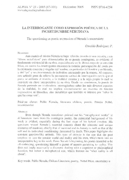 La Interrogante como expresión poética de la incertidumbre nerudiana. [artículo] Osvaldo Rodriguez P.