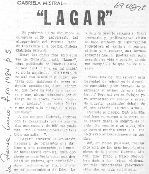 Editan "Lagar" en el centenario de la poestisa Gabriela Mistral. [artículo]