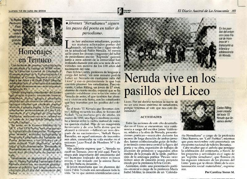 Neruda vive en los pasillos del Liceo [artículo] Carolina Torres M.